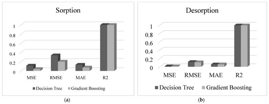 Evaluation metrics for decision tree and gradient boosting during the prediction of: (a) sorption rate of the BNF and (b) desorption rate of the BNF.