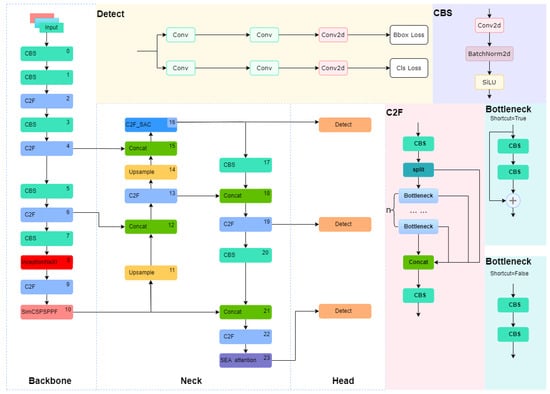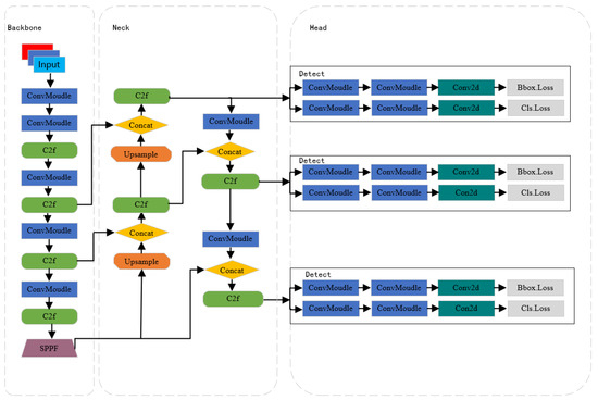 Since its introduction, the YOLO model has made significant achievements in the field of computer vision, particularly excelling in object detection tasks. As a key player in this field, Ultralytics released YOLOv8 on 10 January 2023, following the successes of YOLOv5 and YOLOv7. Building upon the strengths of its predecessors, YOLOv8 further enhances detection accuracy and processing speed, making it even more outstanding in real-time object detection tasks. Compared to previous versions, YOLOv8 may have undergone significant adjustments and optimizations in its algorithm structure, such as introducing more efficient network architectures, more precise object detection algorithms, and more advanced learning techniques. These improvements aim to enhance the model’s ability to recognize objects of different types and sizes while maintaining or improving processing speed, thereby achieving higher practicality and accuracy in various application scenarios. Figure 1 depicts the network structure of YOLOv8. The core architecture of YOLOv8 consists of a backbone network and a neck module. In this structure, the backbone network is responsible for the initial processing of input images, extracting basic visual features through multiple convolutional layers (Conv). These convolutional layers not only capture image information at different levels but also optimize the balance between performance and efficiency through adjustments in their depth and width. The C2f module, an evolution of the C3 module, plays a crucial role in residual learning. It integrates the advantages of the ELAN structure in YOLOv7, enhancing gradient branching by reducing the number of standard convolutional layers and effectively utilizing bottleneck modules. This design maintains the lightweight nature of the model while improving the capability to capture fine details in gradient flow. After feature extraction, the SPPF module further processes the feature maps. By applying pooling kernels of different sizes, the SPPF module can aggregate features of different scales, thereby enhancing the network’s adaptability to changes in target size. This makes the model more robust in detecting objects of different sizes. The neck layer of YOLOv8 adopts an FPN+PAN structure, effectively integrating features from different levels. The FPN structure enhances the model’s semantic understanding of targets by combining high-level semantic information with low-level detail information. The PAN structure, on the other hand, promotes information flow between different feature layers through upsampling and downsampling techniques, further enhancing the fusion effect of features. This mechanism enables the network to perform exceptionally well in processing and fusing target features. The head utilizes features extracted from the preceding two stages to extract category and positional information of detected targets for recognition. It has been replaced by the currently popular decoupled head structure, separating the classification and detection heads. This addresses the differing focus between classification and localization. Additionally, an anchor-free object detection method is employed to improve detection speed. In terms of loss computation, a dynamic allocation strategy for positive and negative samples is utilized, with VFL Loss as the classification loss and DFL Loss+CIOU Loss as the regression loss.