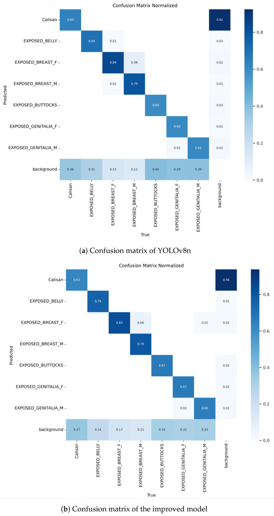 To visually demonstrate the predictive capabilities of our model for sensitive content, we plotted the confusion matrices of the improved model and YOLOv8n, as shown in Figure 8. The horizontal axis of the confusion matrix represents the true classes, while the vertical axis represents the predicted classes by the model. The diagonal values indicate the proportion of correct predictions for each class, while the off-diagonal values represent the proportion of misclassifications. From Figure 8, it can be observed that compared to the confusion matrix of YOLOv8n, most of the values on the diagonal of the confusion matrix of the improved model have increased. This indicates that the improved model has significantly improved performance across multiple categories, especially in recognizing some challenging sensitive categories. For example, in the ‘EXPOSED_GENITALIA_F’ category, the accuracy has increased from 0.60 to 0.67. As adjustments were made to the feature extraction mechanism during model improvement to better capture features related to ‘EXPOSED_GENITALIA_F’ and ‘EXPOSED_GENITALIA_M’, this resulted in a slight decrease in accuracy for the ‘EXPOSED_BREAST_F’ category. We will continue to adjust the model to balance the performance of all categories in subsequent iterations.