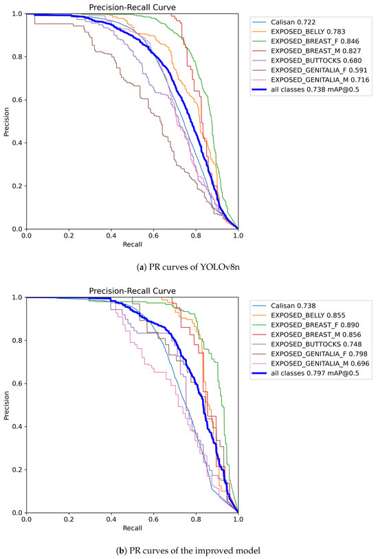 To showcase the precision of model predictions for positive classes at various recall levels, we generated PR (Precision-Recall) curves for both the improved model and YOLOv8n, as depicted in Figure 9. Upon comparison, it is evident that the improved model exhibits significantly enhanced accuracy across most categories, particularly notable in the ‘EXPOSED_GENITALIA_F’ category where accuracy has surged from 0.591 to 0.798. Moreover, the average precision (mAP@0.5) for all categories in the improved model has escalated from 0.738 to 0.797, further confirming the superior overall performance of our model over YOLOv8n. Despite these advancements, we acknowledge there is still room for improvement in the ‘EXPOSED_GENITALIA_M’ category.