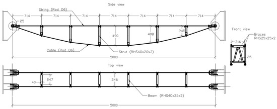 The string–cable structure model parameters were as follows: model span L—5.0 m. The width of the bridge model (distance between two flat structures) is 0.5 m. The distance between the struts is the same and is 0.714 m (see Figure 1). The struts of the model are designed from rectangular cross-section profiles, RHS 40 × 20 × 2. Such cross-sectional dimensions of the struts were chosen to eliminate possible axial deformations of the struts and, at the same time, their effect on the behavior of the bridge model. The heights of the struts were chosen in such a way as to form the shape of the lower element (cable), which is in balance according to the acting axial forces of the struts. These cable coordinates allow the bridge system to deform evenly under a symmetrical load. The maximum height of the strut or cable sag is 0.490 m. The upper element (string) and lower element (cable) are designed from a 6 mm diameter round steel rod.