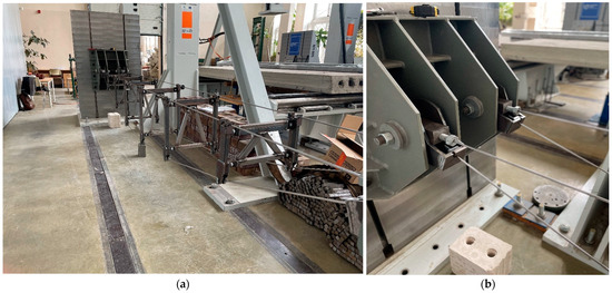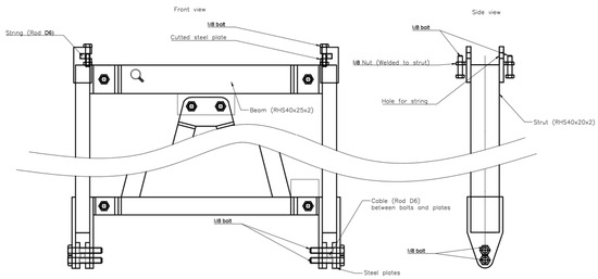 To achieve the goals of the experiment, a model of an innovative string-suspension bridge was designed. The string–cable structure model parameters were selected by performing a numerical analysis and considering the possible length of the real span of such a bridge, L = 50–70 m. According to the prepared drawings, the steel elements of the bridge model were made. The steel structures were manufactured according to the [49] production standard. In the laboratory of the faculty of civil engineering of Vilnius Gediminas technical university, this structure was assembled from separate elements. This bridge model consists of a pre-tensioned string supported through struts on a cable. This string, as the top element of the new combined steel structure, performs the function of the bridge’s stiffness beam. The cable acts as the lower support chord of this combined structure. Strings and cable supports are designed to be immovable both vertically and horizontally and connected in one unit. The test model was designed in such a way that the string could easily be additionally tensioned. The string was continuous throughout the span and anchored at the ends with screws (see Figure 1 and Figure 2). The string and cable in the supporting nodes can freely rotate around an axis perpendicular to the plane of the structure.