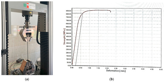 Rod tensile test: (a) bar testing on a tensile machine; (b) the graph of deformations of one of the bars.