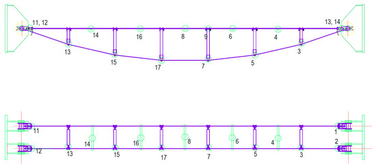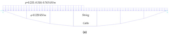 The innovative combined string–cable bridge structure was modeled and calculated using the finite element program [50]. The structure is modeled in one plane (2D). The upper and lower chords (string and cable) are modeled as the only tension truss elements, which takes over only the tensile forces. The struts are modeled as truss elements. The top chord (string) is divided into many finite elements and modeled like a “cable” element (see Figure 10). The static calculations of the combined bridge model were performed as geometrically nonlinear systems.
