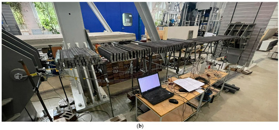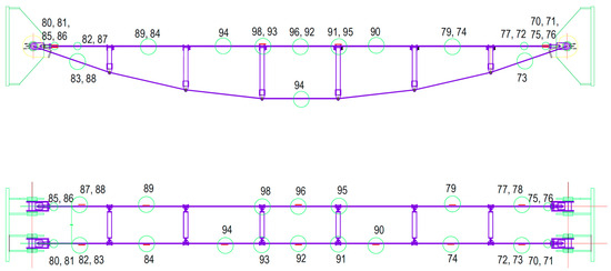 The numbers for the displacements and strain gauges are based on the data and inputs of the Ahlborn ALMEMO 5990-2 device. In Figure 5, sensors from 70–79 are placed in the right part of the model, sensors 80–89 in the left part of the model, and sensors 90–99 in the central part of the model. The tensions of the lower cable are measured by 4 sensors (83, 88, 94, 73, see Figure 5), and those of the string by 24 sensors. This proportion of strain gauge placement was chosen due to the capabilities of the measuring equipment and the maximum number of sensors. Since the focus is on the string that takes the load directly, most of the strain gauges were installed on it.
