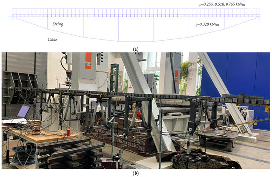 The main objective of the experimental study was to investigate the behavior of a new combined string-suspension steel bridge under static symmetric and asymmetric loads. The diagram of this new bridge is shown in Figure 1 and Figure 2. The combined string–cable structure is made up of two main elements, i.e., chords. The upper chord consists of a prestressed string and the lower chord consists of a cable. Both these chords are connected by struts. Considering the structure of the new steel bridge, a model of this bridge was made. The purpose of the experiment was to determine the actual state of stresses and deformations of the main elements of this bridge model and to evaluate the influence of the pre-tensioned string on the deformability of the bridge model when asymmetric loads are applied. Another goal was to determine the actual state of stresses and deformations of the elements of this bridge model and to evaluate the influence of the pre-tensioned string on the deformability of the bridge when asymmetric loads are applied.