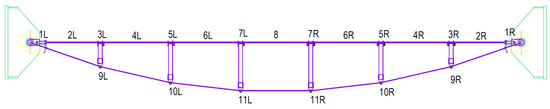 The dimensions and cross-sections of the elements of the FEM bridge model were selected according to the geometric and physical parameters of the experimental model (see Section 3). Additionally, the bridge model was loaded as in the experiment with symmetric and asymmetric loads and at three different prestressing forces: T1 = 0.472 kN, T2 = 1.084 kN, and T3 = 1.506 kN. For loading options, see Section 3, Figure 6 and Figure 7. As in the case of the experimental model, a prestressed element was modeled right next to the support (element 37, see Figure 10).