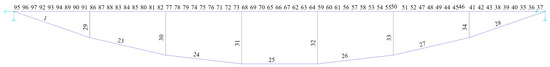 The displacement values of the symmetrically loaded bridge model are presented in Table 3, Table 4 and Table 5, respectively, according to the string pre-tension values: T1 = 0.472 kN; T2 = 1.084 kN; T3 = 1.506 kN. Vertical displacements are given at nodes only. As indicated in the scheme of the deflection gauges (see Figure 4), displacements were measured at the bottom of the struts.