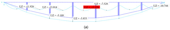 The results of the numerical analysis of the bridge model are presented in Table 11, Table 12 and Table 13 and graphically (Figures 12 and 13). They summarize the data under symmetric and asymmetric loads.