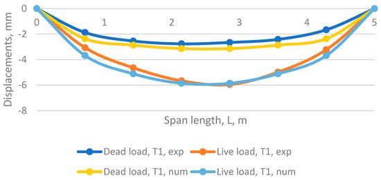 Analyzing the FEM results, it is possible to observe the analogous deformation behavior of the bridge model as shown by the experimental data. Under a symmetrical load, the structure deforms symmetrically, and the maximum displacement occurs in the middle of the span. This is equal to −5.94 mm when the prestress value is equal to T1 = 0.472 kN. When T2 = 1.084 kN, the displacement is −5.91 mm, and when T3 = 1.506 kN it is −5.85 mm. In the case of asymmetric model loading, the largest displacements occur in the part loaded with the live load during the experiment, approximately in the third of the span (5L, see Table 11, Table 12 and Table 13). The schemes of deformation of the model in the cases of symmetrical and asymmetrical loading are shown in Figure 11.