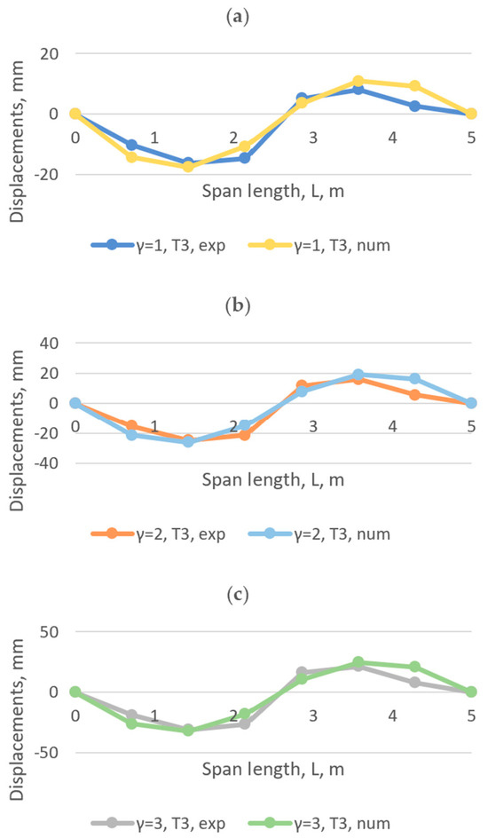 Displacements obtained numerically and experimentally with asymmetric loading, when T3 = 1.506 kN: (a) when γ = 1; (b) when γ = 2; (c) when γ = 3.