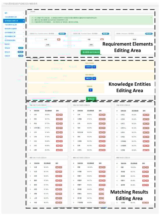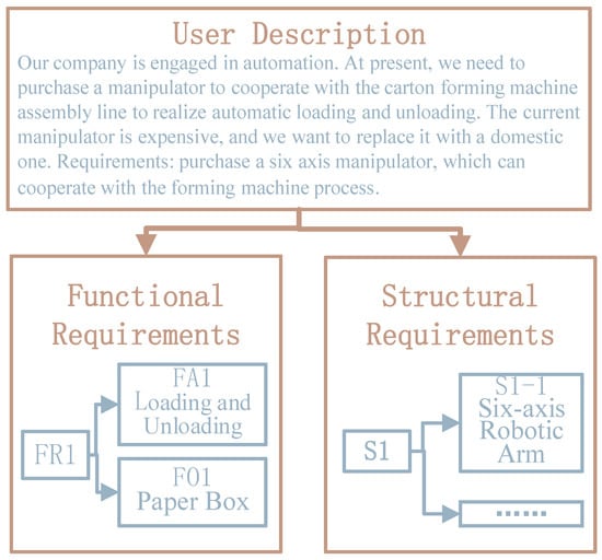 In most descriptions of personalized requirements, users usually describe the specific functions and partial structures of the product. Using natural language processing (NLP) technology, we can identify, classify, and extract the functional and structural requirements from the original text. Additionally, the functional elements can be further divided into FA (verb) and FO (noun). For example, in a real user requirement case shown in Figure 1, we successfully identified functional requirements such as “loading and unloading” (FA) and “paper box” (FO), as well as structural requirements such as “six-axis robotic arm”.