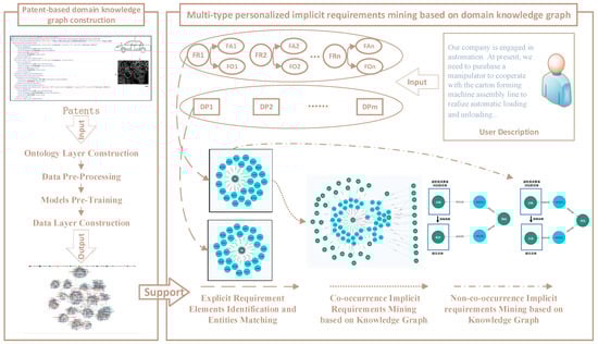 The Internet’s rapid development has led to a surge in the requirement for personalized product design and development. However, meeting implicit requirements that drive product innovation remains a challenge. To address this, this study proposed a method for mining personalized implicit requirements based on a domain knowledge graph. This method involves analyzing personalized requirements and knowledge from domain patents. A patent knowledge ontology layer representation method was proposed, leading to the construction of a domain knowledge graph. This expands the information contained in the knowledge graph. The two NLP models proposed during the study successfully improve the efficiency of graph construction. Two implicit requirement mining methods are proposed: one based on structural similarity and the other based on link prediction. These methods aim to overcome subjective professional limitations and broaden the requirement space for product innovation design.
