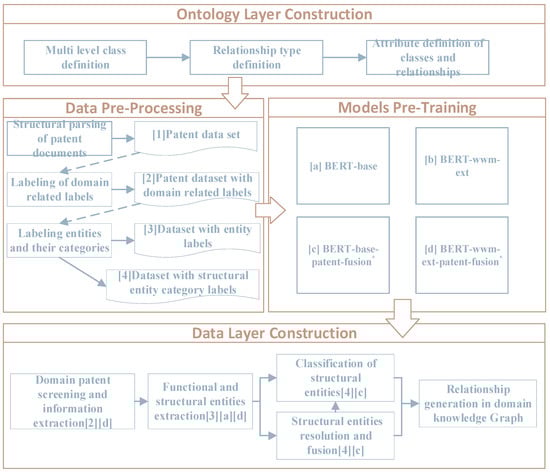 The process of constructing a domain knowledge graph based on patent text is illustrated in Figure 3. It consists of four main stages: ontology layer construction, data pre-processing, model pre-training, and data layer construction. In order to enhance the entity recognition and sentence sequence classification performance of the model in the field of patent text, this study conducts incremental pre-training on a large number of collected domain-related patent text data, and constructs the domain knowledge pre-training models BERT-base-patent-fusion and BERT-wwm-ext-patent-fusion based on two base models, BERT-base and BERT-wwm-ext [], respectively. The pre-trained models marked with * in the figure are the models proposed in this study. The numbers and letters in brackets in the data layer construction represent the data sets and training model numbers referenced in the construction process.