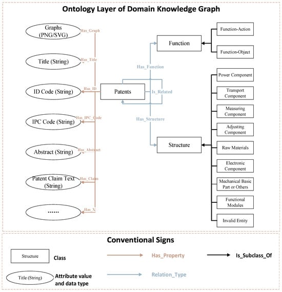This paper uses ontology to standardize entities, relationships, and the types and properties of entities. In the knowledge graph ontology constructed in this paper, the patent attribute part is consistent with most related studies, and the ontology is constructed based on the content contained in the patent text. The schema of the ontology is shown in Figure 4. The ontology of the design knowledge element contained in the patent (Class) is designed by the authors for the research object of this study, based on classic theories in the field of design science, including FBS, axiomatic design, and design standard word basis. The ontology layer schema of the domain knowledge graph can be expressed as <Class, Property, Relation>, where:
