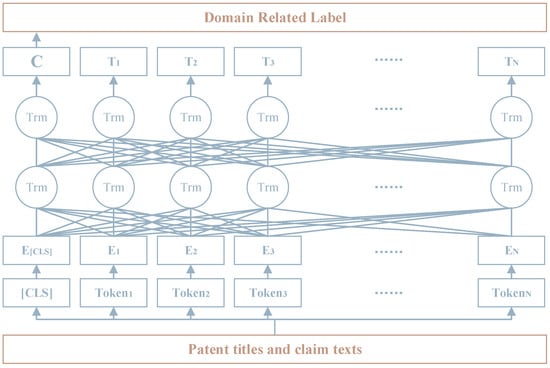 As shown in Figure 5, in the patent title and claim text, the last hidden layer vector C∈RH output after the information extraction of the Transformers module in BERT [] is used as the representation vector of the sentence, where H is the number of neurons in the last hidden layer. Finally, the classification layer weight W ∈ RK×H is adjusted, where K = 2 is the number of labels, and the model training can be completed by calculating the classification error based on the SoftMax result output by the following formula: