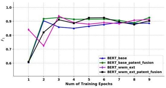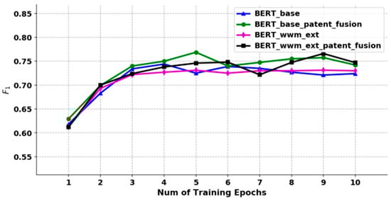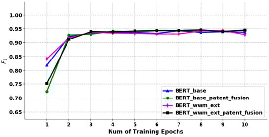 The results are shown in Figure 16. When the training reached the sixth round, the of each model was stable at around 90%. Starting from the seventh round, some models began to overfit, and the on the validation set showed a downward trend. Therefore, based on the performance of each model when the training round was 6, the best training performance at this time was BERT-wwm-ext-patent-fusion (=92.56%).