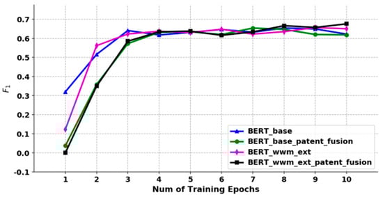 To improve the model’s ability to recognize entities and classify sentence sequences in domain patent texts, this study conducted incremental pre-training using a large number of domain-related patent text data with two base models: BERT-base and BERT-wwm-ext. This led to the creation of the pre-training models BERT-base-patent-fusion and BERT-wwm-ext-patent-fusion, which superimposed domain knowledge. For fine-tuning in subsequent tasks, it will be trained based on four models: BERT-base, BERT-base-knowl-fusion, BERT-wwm-ext, and BERT-wwm-ext-knowl-fusion.