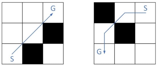 The A* algorithm utilizes an open list and a closed list to manage nodes to be expanded and those that have already been expanded, respectively [19]. When a node is searched, the adjacent nodes are added to the open list and their evaluation values are calculated using Equations (1) and (2). The node with the smallest evaluation value is then selected as the next node to be expanded and is added to the closed list. This process continues iteratively until the target node is added to the closed list, indicating that the A* algorithm has successfully found a path.