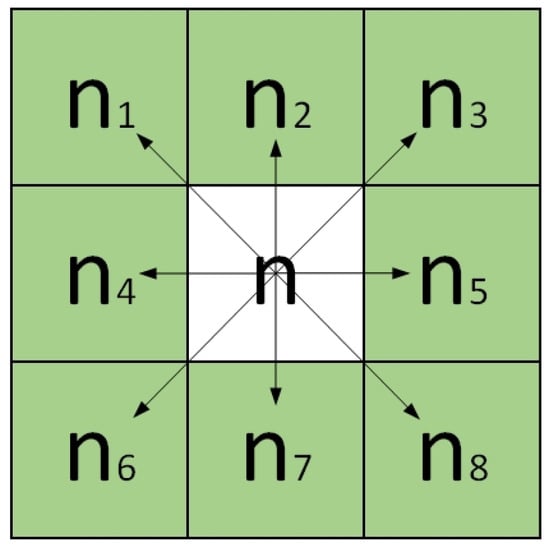 To address the issue of robots easily colliding tangentially with obstacle vertices during the path search process of the traditional A* algorithm, this paper optimizes the selection method for child nodes. For obstacles encountered in the path planning process, this paper removes the child nodes around the obstacle nodes, preventing their selection. As shown in Figure 2, node n is the parent node, and nodes n1 to n8 are the child nodes. The optimized child node selection method is as follows: