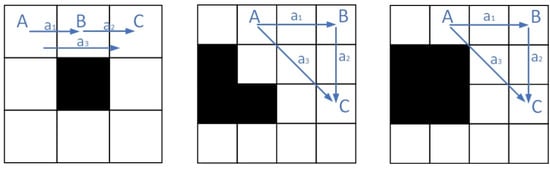 Since the A* algorithm’s selection of child nodes in the path planning process is based on the current node, the generated path will contain many redundant nodes [24] and inflection points. Additionally, because the map is constructed using the raster method [25], the planned path comprises multiple sets of raster centers, resulting in a high number of transitions, as the path nodes can only be located at the center of the raster cells. This leads to a path that is neither the shortest nor smoothest. To address these issues, this paper proposes shortening the robot’s motion path and improving the path smoothness by reducing the number of turning points. For two non-adjacent path nodes, if the connecting distance between them is less than the planned path distance, and the connecting line does not intersect obstacle vertices or pass through obstacles, the redundant nodes in the middle can be deleted. As shown in Figure 4, a1 to a3 represent three different paths. If a1 and a2 are co-located, then node B can be directly skipped to obtain path a3. If a1 and a2 are not co-located, it is necessary to determine whether path a3 intersects obstacle vertices or passes through an obstacle. If a3 intersects obstacle vertices or passes through an obstacle, the original path is retained. If not, the new path a3 is obtained and the original paths a1 and a2 are eliminated.