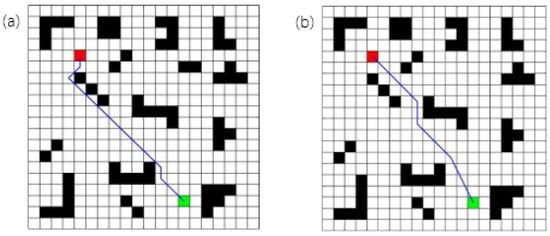 To verify the performance of the alternative A* algorithm, this paper conducts a comparative experiment using the same starting and ending points. Simulations are performed with both the traditional A* algorithm and the alternative A* algorithm, and the experimental results are presented in Figure 6. The grid map size is 20 × 20, and the length of each grid unit is 1 m. As shown in Figure 6a, the path planned by the traditional A* algorithm is closer to the obstacles, which can easily lead to collisions between the AGV and the obstacles, resulting in poor safety of the global path. Figure 6b demonstrates that after adopting the obstacle grid method and optimizing the child node selection method, the distance between AGVs and obstacles in the global path increases significantly, avoiding collisions and improving the path safety. Compared with the traditional A* algorithm, the path distance planned by the algorithm with smoothness optimization is significantly shorter, and the AGV’s movement process is smoother.
