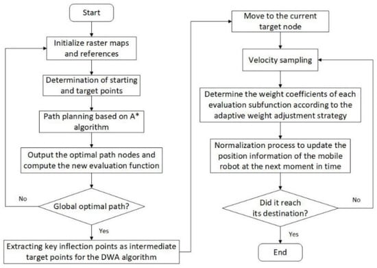 In this paper, we propose an alternative implementation of the A* algorithm and optimize the DWA algorithm. While the proposed alternative A* algorithm enhances global path planning, it lacks the capability to avoid unknown and moving obstacles. On the other hand, the improved DWA algorithm can avoid unknown obstacles but the path it generates is not globally optimal. Therefore, this paper presents a fusion algorithm that combines the alternative A* algorithm with the DWA algorithm [28]. The flowchart of the fusion algorithm is shown in Figure 8.