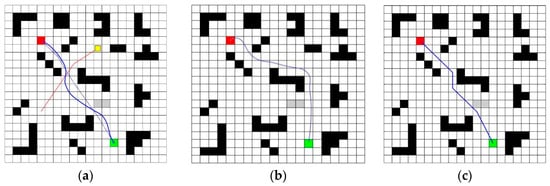 The simulation results of the three algorithms are shown in Figure 9. The green grid represents the starting point, the red grid represents the target point, the yellow square simulates the dynamic obstacles, and the gray square simulates the unknown static obstacles.