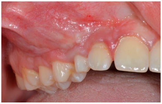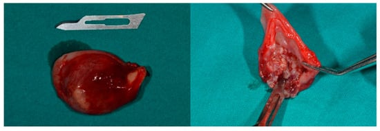 The treatment plan included the cystectomy and the surgical extraction of the impacted canine with the elevation of a full-thickness flap. The surgery was scheduled for local anesthesia. The complications of the surgery included communication with the maxillary sinus. Routine preoperative laboratory tests including a full blood count, blood clotting tests, azotemia, glycemia and creatinine levels were conducted. Additionally, a cardiologic evaluation, including an electrocardiogram, was performed. The patient was briefed on the potential risks and benefits associated with the surgical procedure. Informed consent was obtained, and the surgery was scheduled accordingly. After local anesthesia with three carpules of articaine hydrochloride + adrenaline 1:100,000, a full-thickness flap with a mesial release incision to the lateral incisor and distal to the first molar was performed by using a Bard–Parker #15 scalped blade. The flap was raised and held in place using a Langenbeck retractor (Figure 3), and the lesion was completely enucleated along with the impacted right maxillary canine (Figure 4). The permanent canine was entirely within the lesion. The tooth and lesion were removed together. Figure 5 shows the clinical aspect of the lesion. The lesion was entirely benign and encapsulated which allowed the roots of the involved dental elements (1.2, 5.3, 1.4, 1.5, 1.6) to be easily isolated during the enucleation. Saline solution rinses and closure with Vicryl 3.0 sutures were performed.