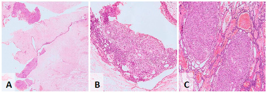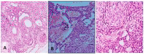 (H&E stain): (A) cystic fibroconnectival wall lined by odontogenic epithelium with intraluminal solid epithelial proliferation (2×); (B) cribriform peripheral areas alternating with solid pale nests (10×); (C) multinodular epithelial proliferation admixed with hemorrhagic areas.