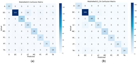 The confusion matrix for MobileNetV3_All, the fully constructed model in this paper, is shown in Figure 7f. This model integrated various modules and strategies, leading to improved recognition performance compared to the benchmark MobileNetV3. Notably, while ductal carcinoma (DC) was often misclassified as lobular carcinoma (LC) due to the subtle differences between subtypes, the addition of attention mechanisms and multi-layer information fusion enabled the model to capture finer lesion features, thus distinguishing breast cancer subtypes more accurately. The enhanced MobileNetV3 model demonstrated superior recognition results, significantly reducing the misclassification rate. Furthermore, the model exhibited a more balanced recognition across all breast cancer histopathology image types, markedly improving its ability to identify rare subtypes.