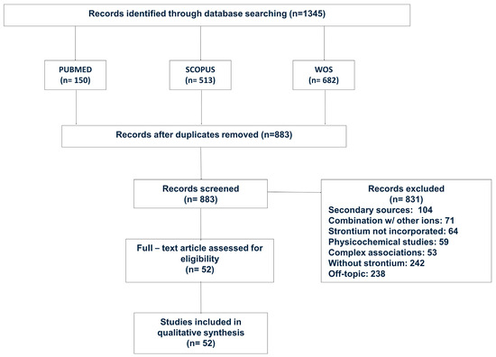 The following exclusion criteria were applied to the studies: review articles, patent applications, book chapters, theses, mixed ions, strontium not incorporated into the biomaterial, performs only physical-chemical tests, or calcium phosphate biomaterials that were mixed or integrated into complex combinations (such as polymers, bioglass, biogel, etc.).