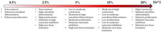 The beneficial effects of Sr release on bone formation and cellular responses are dose-dependent. For example, controlled releases of Sr in the range of 2–5 ppm have been shown to stimulate osteoblastic activity and enhance mineralization, as demonstrated by multiple studies. On the other hand, excessive release, such as 20–100 ppm, has been associated with inhibitory effects on calcification and potential cytotoxicity.