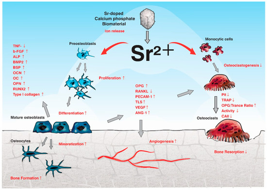 Growth factors are of high relevance in bone metabolism and are also targets for stimulation during the development of smart materials. It has already been shown that the presence of strontium associated with calcium phosphate-based materials significantly increased the expression and release of bFGF and VEGF [23]. Liu et al. [35] demonstrated in vivo that there was an increase in the secretion of both growth factors, especially in the presence of the ceramic material implant containing 8% strontium substitution. These data make it possible to hypothesize that this type of material can increase the vascularization in the implant site, which is essential to the process of regeneration of any lesion. Huang et al. [28] proposed that the presence of a ceramic with 8% substitution of calcium ions by strontium can decrease TNF-α secretion while increasing OPG expression and decreasing RANK-L secretion. The combination of these factors could result, in vivo, in the reduction of inflammatory cells migration to the lesion site, thus accelerating the regeneration of the bone tissue. This hypothesis requires confirmation and the study of other inflammatory cytokines in addition to TNF-α, since Gu et al. [23] have shown that there is an increase in the expression of PECAM-1 in the presence of strontium. Due to the complexity of the bone tissue, the increase in the expression of this gene could be related to inflammatory signaling, promoting an increase in the population of leukocytes. It could also provide further evidence that Sr-doped calcium phosphates favor the formation of new blood vessels, which is essential to the process of injury regeneration [23].