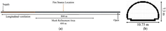 Tunnel Fire Model. (a) Longitudinal tunnel model; (b) cross-section of the model.