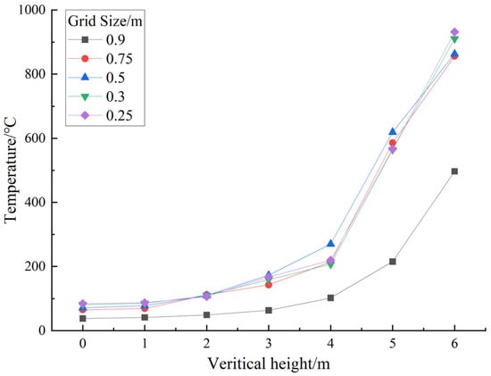 The calculation results indicate that the suitable grid size for the 30 MW fire varies between 0.233 m and 0.94 m. Figure 2 shows the comparison of simulation results with grid sizes of 0.25 m, 0.3 m, 0.5 m, 0.75 m, and 0.9 m for the case of a 0 m altitude and without ventilation at 300 s. It can be seen from Figure 2 that with the decrease in the grid size, the discrepancy in temperature at different vertical heights with different grid sizes becomes negligible except for the grid size of 0.9 m. This means that when the grid size is no greater than 0.75 m, further refining the grid size cannot significantly improve the simulation accuracy, and more simulation time is required. Thus, the final determined grid size is 0.5 m. Considering the more complex flow fields near the fire source, the grid size in the zone X = 200–600 m, Y = −7–7 m, and Z = −1–7 m was refined as 0.25 m.