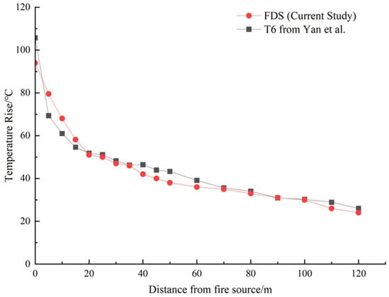 We attempted to compare the simulation results with the experimental results in order to ascertain the reliability of the simulation results. Yan et al. [] conducted six full-scale tunnel fire experiments in a tunnel at a high altitude of 4100 m. The smoke-spreading characteristics, maximum temperature, and longitudinal temperature distribution were studied. In this research, at an altitude of 4100 m, the ambient pressure is 62.63 kPa, the ambient temperature is 9–11 °C, and the ambient air density is 0.84 kg/m3. The longitudinal ventilation velocity of Test 6 varies from 0 to 1 m/s. The fire area is 2.0 m2 and the fire scale is 1.55 MW. A special test was conducted to compare with the experiment results based on the above environmental conditions. The comparison results shown in Figure 3 show that the FDS predictions are in good agreement with the experimental results.