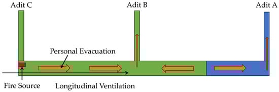 Figure 4 shows the escape options for the worst-case scenario. When the fire source located at the entrance of an adit for people passing in the middle of the tunnel, this adit is not available for personal evacuation. In this situation, an adjacent adit would bear the personnel load within 1.5 times of the spacing. As set out above, the large truck as a fire source is located at the entrance of adit C. All passengers within adit B and adit C and half the passengers within adit A and adit C are going to evacuate from adit B.