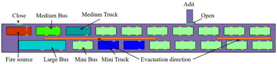 Based on the same tunnel model shown in Figure 1, an evacuation model was created in Pathfinder. The width of adits for people passing is 2 m []. Considering the worst-case scenario, the number of vehicles and personnel load should be determined by the tunnel traffic jam situation. Based on the literature [,,], the number of vehicles and personal load under the traffic jam situation in the tunnel model is determined, as shown in Table 2.