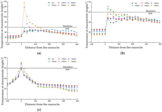 Variation in longitudinal temperature at characteristic height at 300 s. (a) Critical group; (b) General group; (c) 0 group.