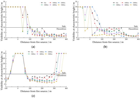 Variation in longitudinal visibility at characteristic height at 300 s. (a) Critical group; (b) General group; (c) 0 group.