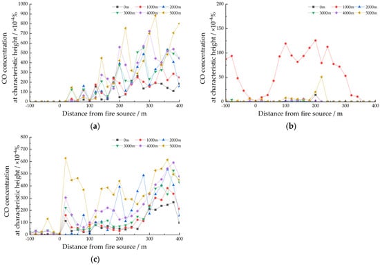 Variation in longitudinal CO concentration at characteristic height at 300 s. (a) Critical group; (b) General group; (c) 0 group.