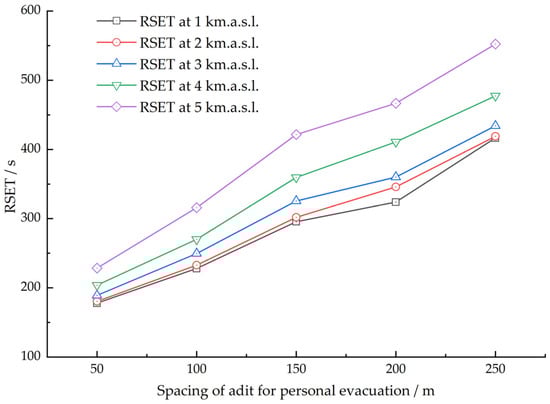 The RSET at an altitude of 0 m is the same as the RSET at an altitude of 1 km. As the figure shows, the difference in RSET at different altitudes is small when the spacing of adits for personnel evacuation is small. However, when the pacing of adits for personnel evacuation comes to 150 m, the difference in the RSET between a high-altitude tunnel and a low-altitude tunnel becomes obvious. For example, the difference in the RSET between a tunnel at an altitude of 5 km and a tunnel at an altitude of 1 km is 167% greater when the spacing is 250 m compared to when it is 50 m.