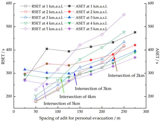 RSET of tunnels at different altitudes under different spacing of adits for personal evacuation.