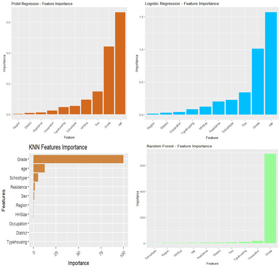 Figure 3 illustrates the importance of various features in a probit regression model, revealing that age and grade are the most significant predictors, each with an importance score of just above 0.6. Sex also plays a notable role, with a score of approximately 0.25, while household size contributes moderately, with a score of about 0.1. School type, type of housing, and occupation had minimal impact, with scores ranging from approximately 0.05 to just below 0.1. Residence, district, and region had negligible influence, with importance scores close to 0. This analysis underscores that demographic and educational factors are the primary drivers in the model, whereas geographic and housing characteristics have minimal effects.