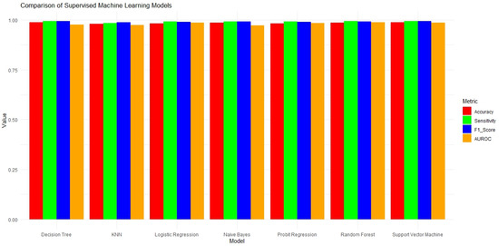 The generated plot provides a comprehensive comparison of seven supervised machine learning models based on four critical performance metrics: accuracy, sensitivity, F1 score, and AUROC. The support vector machine (SVM) and decision tree models demonstrated superior performance across most of these metrics, with both achieving the highest values for accuracy and F1 score (0.988 and 0.993, respectively). Furthermore, these models exhibited very high sensitivity (0.993), suggesting that they are particularly adept at identifying positive cases. This consistent performance across multiple metrics indicates that the SVM and decision tree models are highly effective and reliable for classification tasks.