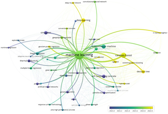 In order to evaluate the development of the research regarding property predictions using machine learning, a bibliometric study in the Web of Science database was performed. The following query was used: (“concrete”) AND (“properties” OR “thermal conductivity”) AND (“machine learning” OR “deep learning” OR “artificial neural network” OR “ANN”). The search criteria used in this bibliometric study summarized 1673 articles and reviewed articles published between 2014 and 2023. Then, the overall result was imported into VOSviewer to analyze the keywords in each paper’s title or abstract. This generated the overlay cluster representing the development of the research over the years (Figure 1).