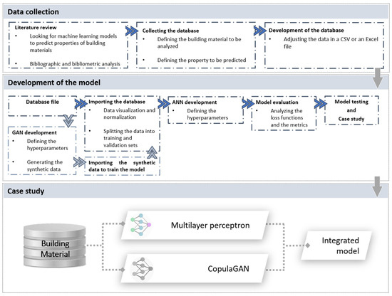 The proposed methodology encompasses two primary components: the development of an MLP for material property prediction based on its features and the utilization of a GAN for data augmentation to enhance the dataset and improve the accuracy of the first model. This section outlines the proposed methodology applied to this work to achieve these objectives, broken down into three steps: data collection, model development, and the model’s application in a case study (Figure 2).