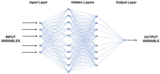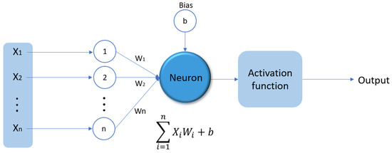 A Multilayer Perceptron (MLP) is an artificial neural network that can be applied to solve many problems, including classification, regression, and pattern recognition. A typical MLP model comprises three blocks of interconnected neurons: the input layer in which each neuron represents a data feature; the hidden layers that could have one or more layers depending on the complexity of the problem; and the output layer, representing the response output (Figure 3). Each neuron in the network is bonded to other neurons through connection weights. Each neuron in a neural network receives an input () that is multiplied by a weight () and these are summed with each other and added to the bias value (). Then, the result is transferred to the activation function, which adjusts the final output (Figure 4). Each layer of neurons gathers input from the previous layers, and the outputs of neurons within one layer become the inputs to neurons in the following layer. Finally, the last layer produces the predictions of the model.