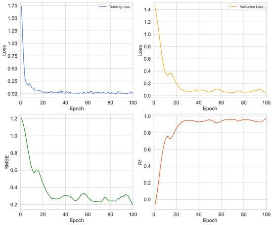 Regarding the best-performing model, an analysis of the loss functions and the performance metrics versus the number of epochs is conducted (Figure 6). As the number of epochs progresses, a significant pattern appears in the training and validation processes. Both training and validation losses exhibit an exponential decrease as iterations continue. In parallel, the performance metrics on the validation dataset align with the behavior of the loss function. While RMSE steadily declines, R2 shows a corresponding increase, achieving its minimum and maximum value at approximately 100 epochs. This observed trend reflects the model’s capacity to optimize its predictive accuracy as it refines its learning over successive epochs.